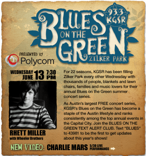 KGSR will be hosting Blues on the Green tonight at 7:30pm at Zilker Park for free! The featured act is Rhett Miller with the Wheeler Brothers. Hope you can make it out for another fun Austin event tonight!